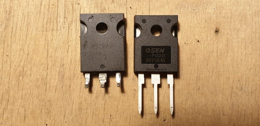 De gedesoldeerde MOSFET-transistor zal waarschijnlijk een HUF75344G3 zijn, een vermogens-MOSFET met de belangrijkste kenmerken: 55V, 75A en 8mΩ doorlaat-weerstand in open toestand. Het wordt geleverd in een TO-247 behuizing. Je kunt het vervangen door dezelfde transistor of iets vergelijkbaars zoeken. De spanning en stroom mogen hoger zijn. De weerstand hetzelfde of kleiner zijn. Een voorbeeld, de IRFP064N is een uitstekende vervanging met dezelfde maximale spanning van 55V, dezelfde weerstand van 8mΩ, maar met een hogere toegelaten doorlaatstroom van 110A, wat een veiligere marge biedt ten opzichte van de originele 75A, en tevens een hogere temperatuur tolerantie van 175 graden Celsius ten opzichte van de originele 150 graden Celsius.